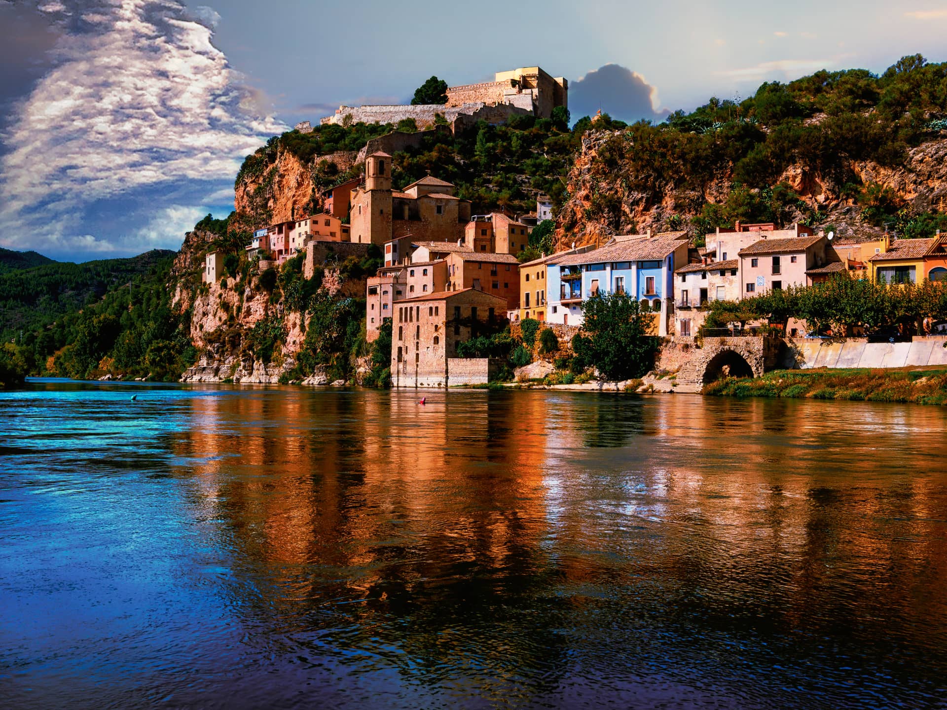 Miravet village is perched on steep cliffs along the Ebro River, creating a dramatic and unforgettable landscape. The 9th-century Templar castle dominates the village and is one of the finest examples of military architecture in Europe. The calm river mirrors both the castle and the old houses, creating stunning reflections and enhancing the picturesque scenery. Steep cliffs, gardens, and narrow streets add depth and charm to the village, blending nature and history. Visitors can explore pottery workshops, watch birds nesting on the cliffs, and enjoy kayaking along the reflective waters.