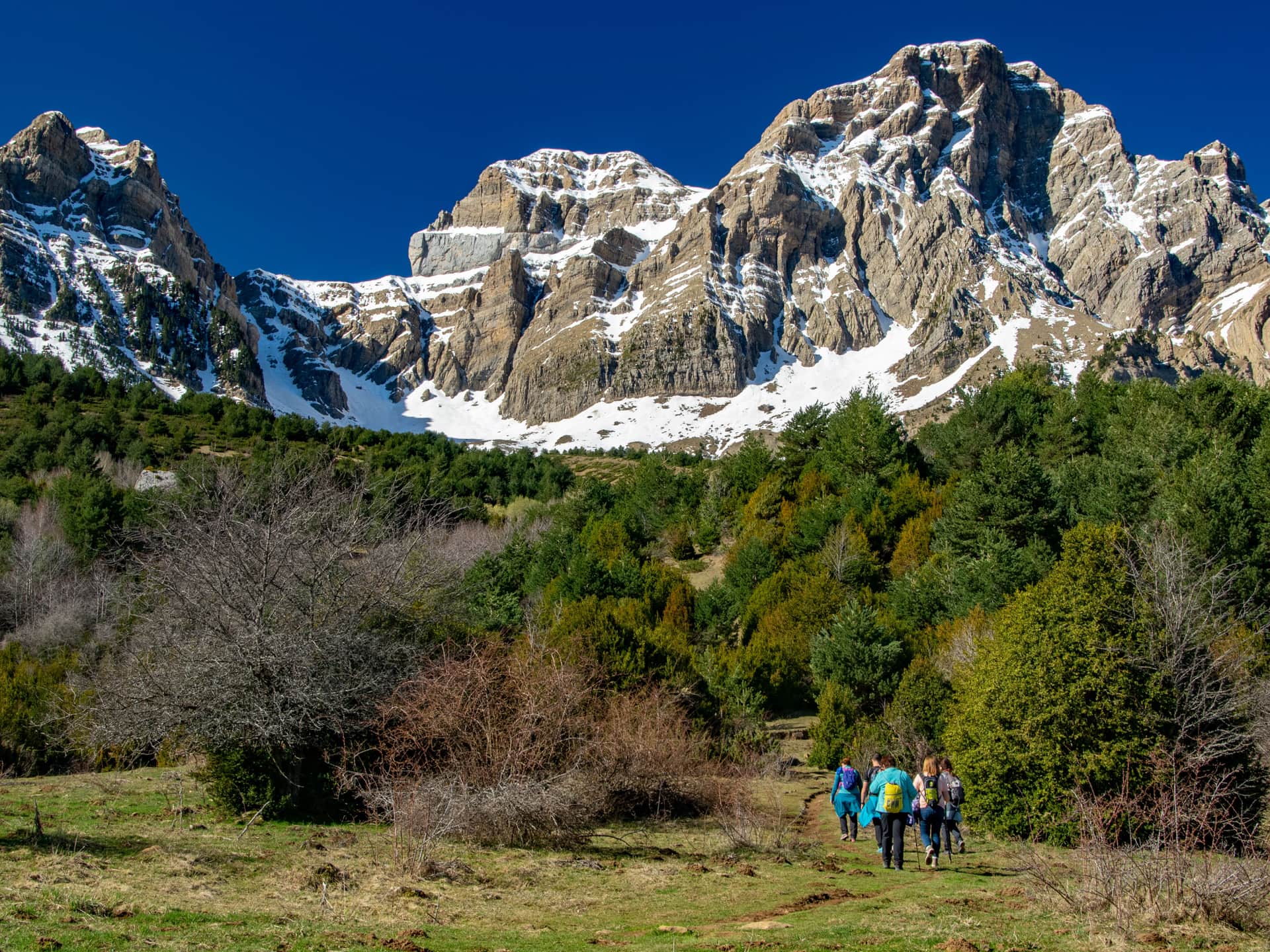 Pena Telera mountain rises majestically above the Tena Valley, its limestone cliffs forming an imposing natural fortress. The steep slopes bear traces of ancient glaciers, with deep gullies and couloirs carved by centuries of wind and snow avalanches. Sunset often casts a rich reddish hue across the cliffs, contrasting sharply with the cold high-mountain sky. The limestone layers at the mountain’s base record millions of years of geological history, uplifted by enormous tectonic forces. Harsh conditions limit vegetation to resilient alpine plants on the scree, while snow can linger in deep crevices throughout the summer.