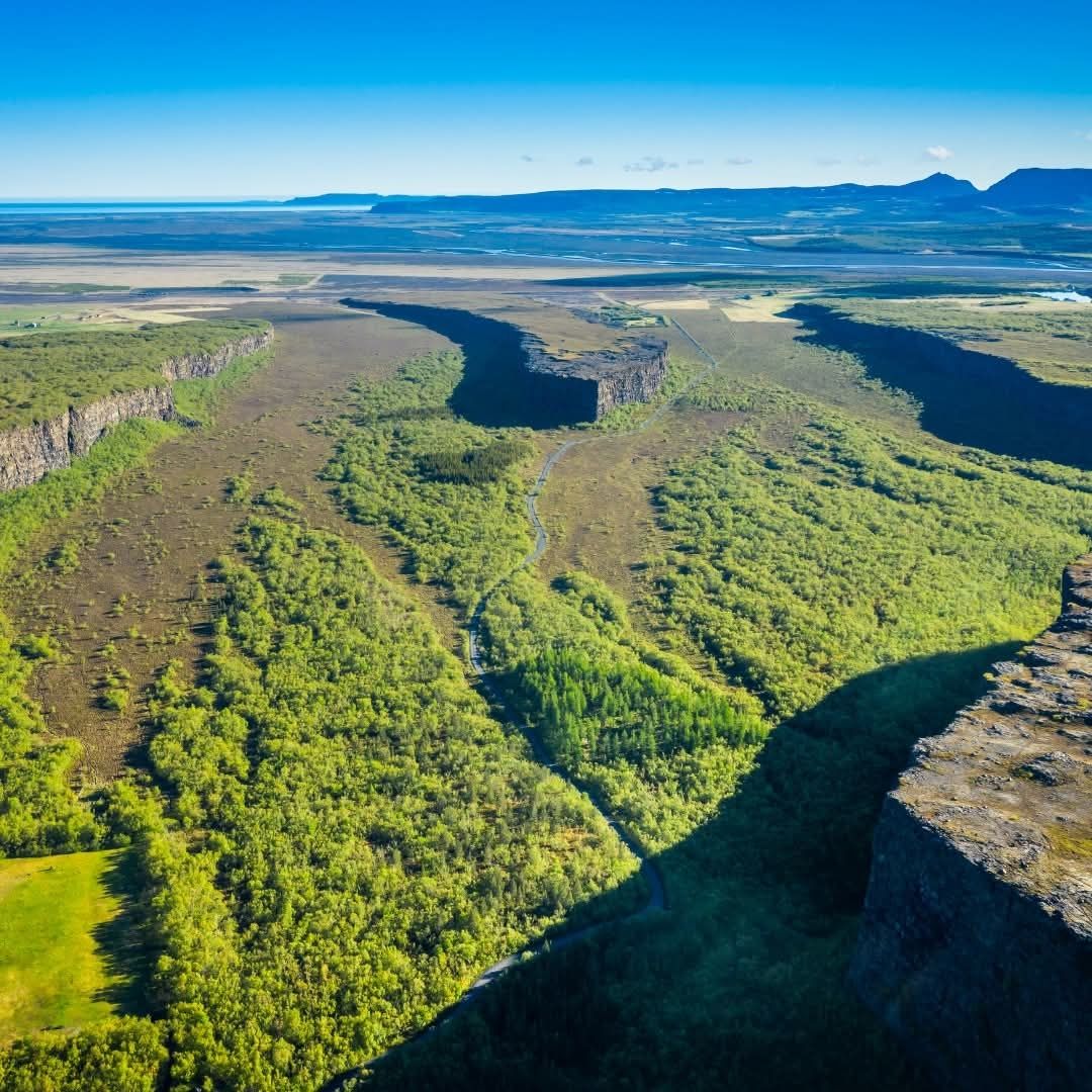 Аусбирги — впечатляющий каньон подковообразной формы на севере Исландии, известный своими высокими скальными стенами и необычно зелёной долиной. Его образование связывают с мощными геологическими и водными процессами, которые сформировали ландшафт тысячи лет назад. Лесистое дно каньона контрастирует с отвесными скалами высотой до 100 метров, создавая яркое природное убежище. Удобные тропы и смотровые площадки делают Аусбирги одним из самых доступных и запоминающихся природных мест региона.