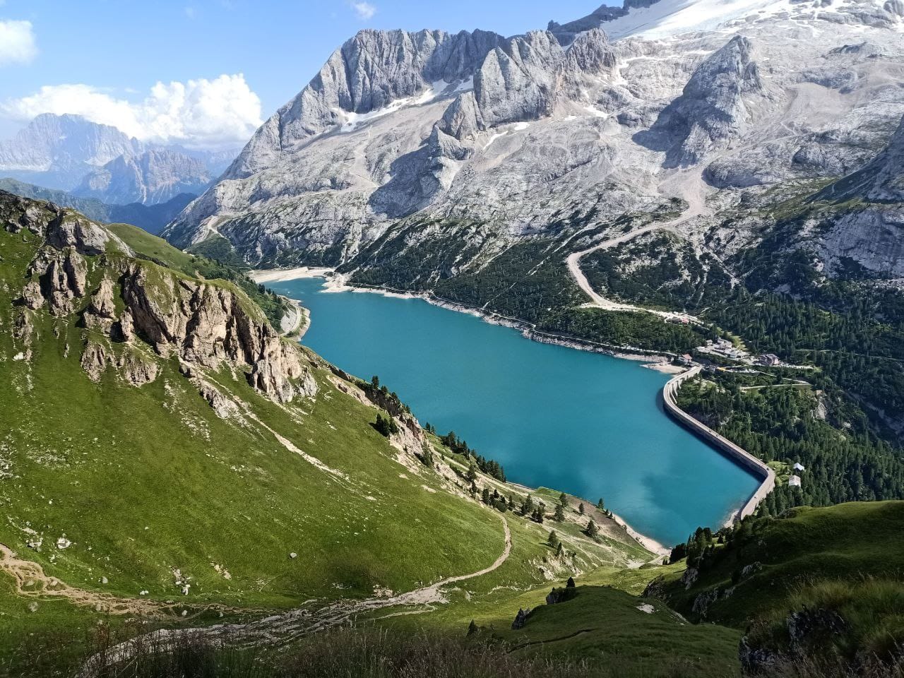 Озеро Федайя — это высокогорное альпийское озеро в Доломитах, расположенное на высоте примерно 2 050–2 057 метров над уровнем моря, на перевале под ледниковым массивом Мармолада. Озеро образовалось из талой ледниковой воды и позже было превращено в водохранилище после строительства плотины в 1950-х годах — так здесь сочетаются природная красота Альп и инженерное вмешательство. В ясные дни вода отражает окружающие вершины — включая Мармоладу и Чиветту — что особенно эффектно во время заката. Вокруг озера проложена благоустроенная тропа вдоль плотины, удобная для прогулок; летом озеро популярно среди любителей хайкинга, отдыха и фотографий. Зимой и в холодные месяцы район вокруг озера вместе с соседними склонами и подъёмниками становится частью горнолыжной и спортивной зоны.