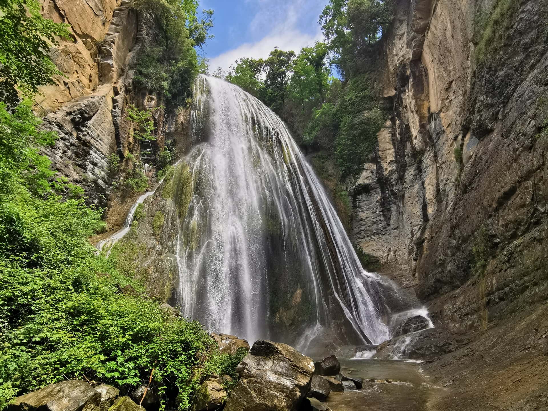 Водопад Салт-дель-Мир образует природный амфитеатр под скальным навесом, за водяной завесой можно пройти. Окружающий лес усиливает ощущение уединения и тишины. Покрытые мхом скалы создают естественное святилище для каскада. На дне формируется небольшое озеро. Рядом заброшенные мельницы добавляют исторического очарования.