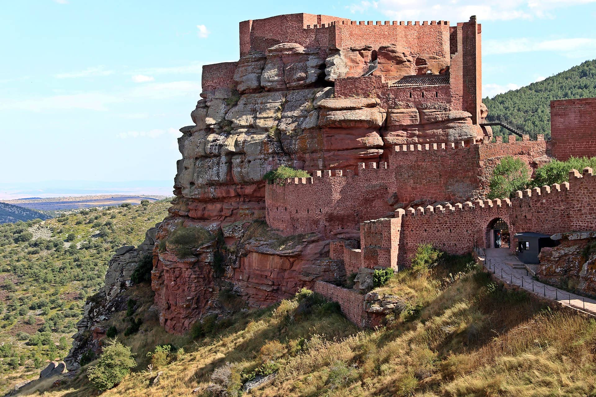 Замок Перасенсе — уникальная крепость XIII века, построенная на утесе из красного песчаника. Он возведен на месте старой мусульманской крепости и органично вписывается в рельеф. Красный оттенок стен повторяет цвет скал, подчеркивая единство с ландшафтом. Пустынное высокогорье Сьерра-де-Альбаррасин создает тихую и суровую атмосферу. Крепость выглядит одновременно средневековой и почти инопланетной, особенно на закате.