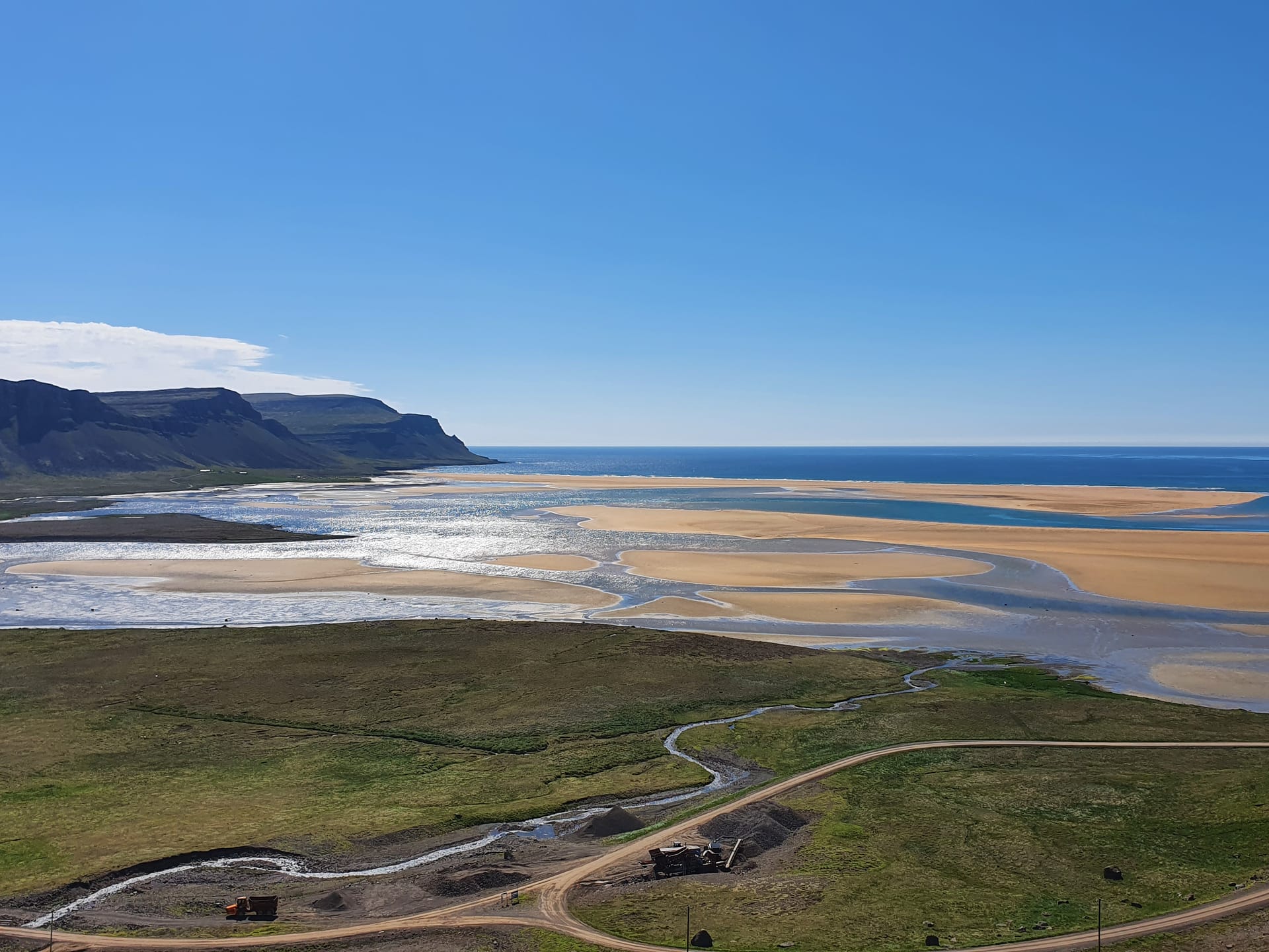 Пляж Раудасандур тянется почти на десять километров вдоль южного побережья Западных фьордов. Широкая песчаная полоса контрастирует с темными скалами и бирюзовыми водами океана. В отличие от большинства пляжей Исландии, пляж Раудасандур состоит из измельченных морских раковин, а не из базальта. Во время отлива здесь появляются зеркальные мелководья, усиливающие ощущение простора. Пляж также известен колонией тюленей, которых часто можно увидеть отдыхающими на песке.