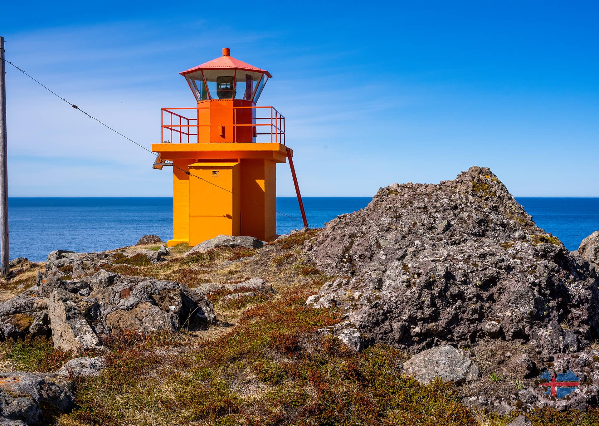 Маяк расположен на узкой полосе земли между отвесными скалами и океаном. Он охраняет вход в суровые воды между двумя фьордами. Окружающий пейзаж тихий, масштабный и практически нетронутый. Горы здесь резко обрываются прямо в море, подчеркивая дикую природу региона. Яркая башня выглядит крошечной точкой на фоне колоссального ландшафта.