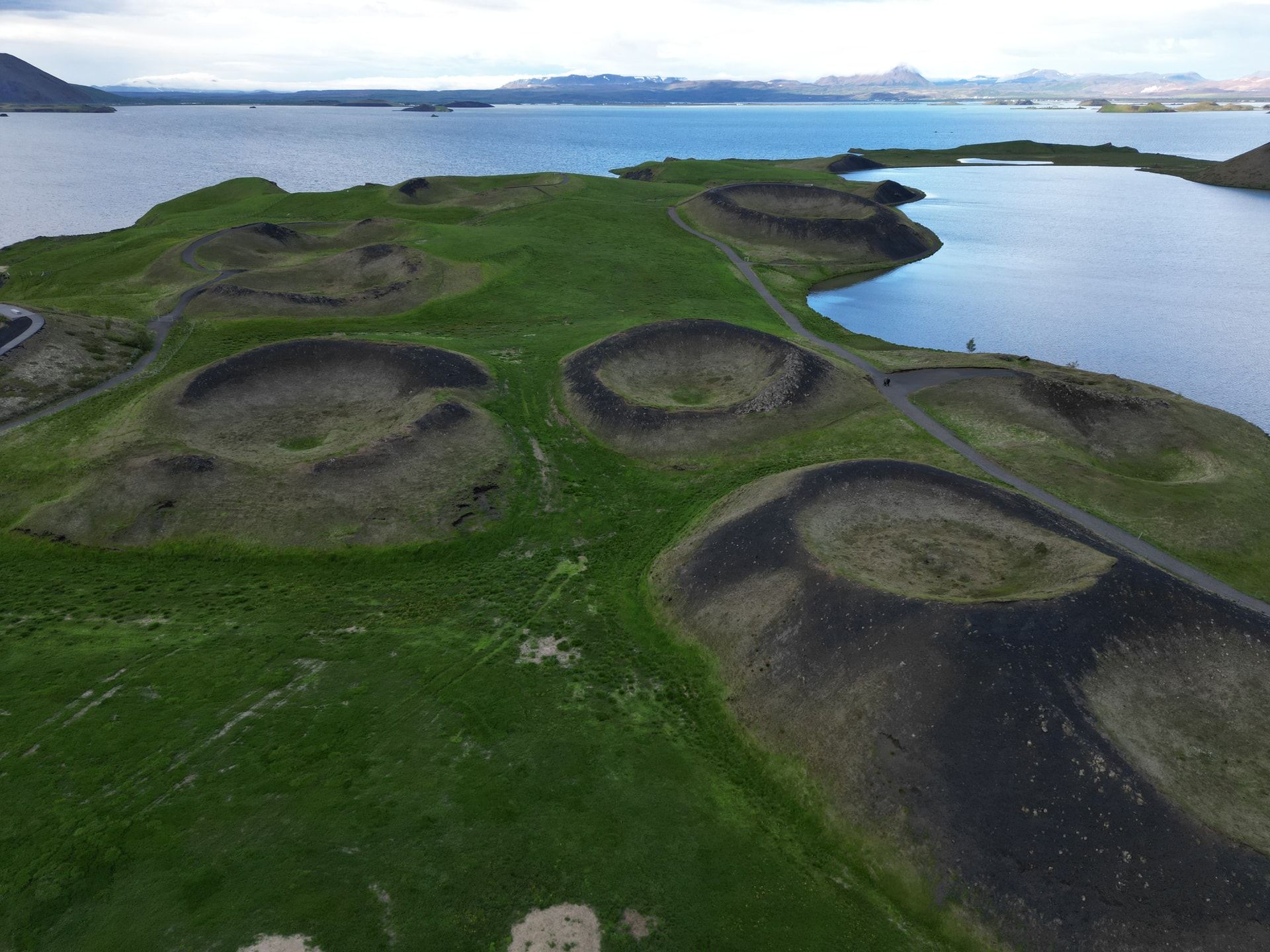 Кратери Скутустадагігар є унікальним скупченням псевдократерів на південному березі озера Міватн. Вони утворилися близько 2300 років тому, коли лава текла болотистою місцевістю, спричиняючи парові вибухи. На відміну від справжніх вулканів, кратери не мають жерла, що з’єднувало б їх із магматичним осередком. Доглянута кільцева стежка проходить навколо і на вершини трав’яних конусів, відкриваючи панорамні види на озеро та пташиний світ. Ця територія є охоронюваним пам’ятником природи.